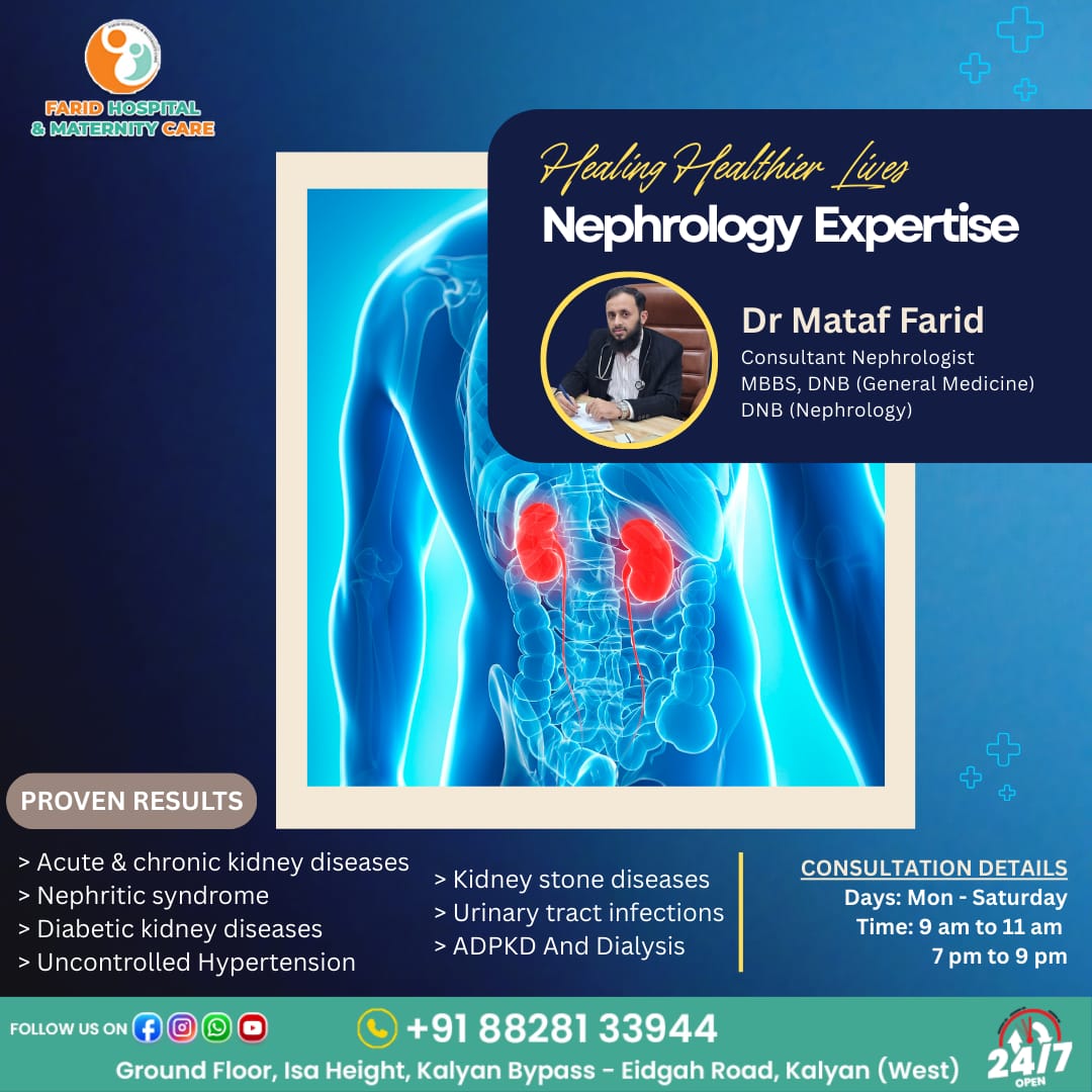 Farid Hospital & Maternity Care brings together specialist kidney treatment, affordable dialysis, complete maternity and women's health care, and advanced services in surgery, orthopedics, urology, and diagnostics — all under one roof. Led by Dr. Mataf Farid (Nephrologist) and Dr. Safiya Farid (Obstetrician & Gynecologist), our team of eminent doctors combines clinical excellence with genuine, patient‑first care for every family in Kalyan.
